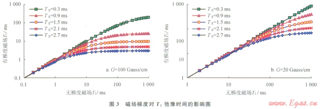 對比模擬的兩種大小的內(nèi)部梯度磁場對T2譜影響的成果圖可看出(圖3):相同回波間隔下,內(nèi)部磁場梯度越強,相同弛豫組分對應的T2譜時間越短,意味著T2譜前移越明顯,使其向弛豫時間變短的方向移動。
