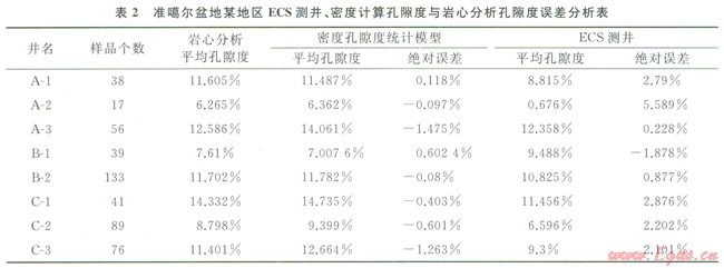 密度測井反映的是儀器探測范圍內(nèi)地層的總密度,能有效反映地層的總孔隙度,對各種類型的孔隙度都能有效反映,如火成巖地層中大的氣孔、溶蝕孔洞空隙都能反映。采用巖心刻度測井的方法,分區(qū)塊、分巖性建立了不同區(qū)塊、不同巖性的密度測井與巖心分析孔隙度間的線性回歸模型用于計算火成巖儲層的孔隙度,實際應用表明,利用密度曲線計算的孔隙度與巖心分析孔隙度之間的誤差較小(表2)。