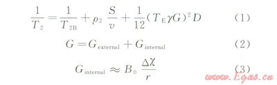 式中T2B為體積弛豫,ms;D為擴散系數(shù),cm2/s;G為觀測時的梯度磁場;g為旋磁比;TE為回波間隔;r2為橫向表面弛豫強度;S/V為巖石比表面;B0為外加磁場強度;r為磁場變化的距離;Dc為巖石骨架顆粒與孔隙流體之間磁化率的差。