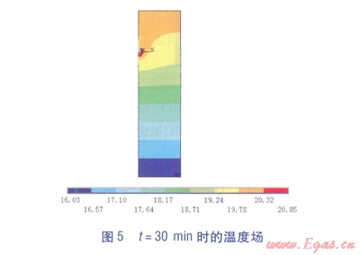 ①運(yùn)用有限元軟件ANSYS的熱分析功能,模擬得到了埋地管道氣密性試驗(yàn)過(guò)程中溫度場(chǎng)隨時(shí)間的變化情況:試驗(yàn)開始階段,管道溫度下降較快,30min后,管道溫度下降速度減緩,經(jīng)過(guò)1.5h后,管內(nèi)外溫度場(chǎng)基本達(dá)到穩(wěn)定。