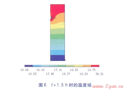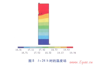 通過(guò)有限元軟件模擬了管道氣密性試驗(yàn)過(guò)程24h內(nèi)的溫度場(chǎng)分布,不同時(shí)刻的溫度場(chǎng)分布見(jiàn)圖3~8,t為模擬的時(shí)間,云圖下方彩色標(biāo)尺的顏色深淺表示溫度的高低,數(shù)值表示溫度值,單位為℃。