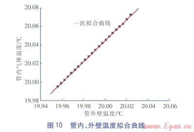 由圖9中傳熱進(jìn)行到60min后管道中心與管外壁的溫度曲線可以看出,當(dāng)傳熱達(dá)到穩(wěn)定時(shí),管內(nèi)溫度與管外壁溫度曲線接近重合,管內(nèi)溫度略高于管外壁溫度。取溫度場(chǎng)達(dá)到穩(wěn)定(1.5h)后的管內(nèi)、管外壁溫度數(shù)據(jù)進(jìn)行擬合,得到管內(nèi)和管外壁溫度的擬合曲線(見(jiàn)圖l0),其關(guān)系式見(jiàn)式(4)。圖l0中,黑點(diǎn)為模擬得到的管內(nèi)和管外壁溫度數(shù)據(jù)點(diǎn),紅線為一次擬合曲線。由圖10可以看出,埋地管道溫度場(chǎng)達(dá)到穩(wěn)定后,管內(nèi)溫度和管外壁溫度的溫差均小于0.1℃,與試驗(yàn)所獲得的數(shù)據(jù)基本符合(見(jiàn)表2)。