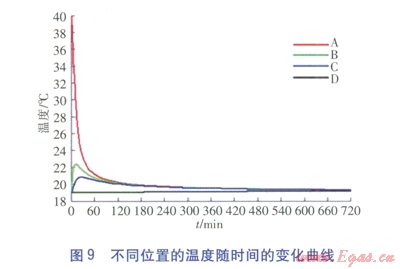 分別取管道中心A、管道外壁B、水平方向距管道0.1m處土壤C及水平方向距管道0.5m處土壤D這4個(gè)點(diǎn),得到各點(diǎn)處溫度隨時(shí)間的變化曲線,見(jiàn)圖9。