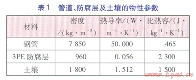 以規(guī)格為Æ219×6的20號(hào)鋼管為例進(jìn)行計(jì)算,采用3PE防腐,防腐層厚度為2mm,埋地深度h1為1m。管道、防腐層及土壤的物性參數(shù)經(jīng)現(xiàn)場(chǎng)測(cè)量,結(jié)果見(jiàn)表1。