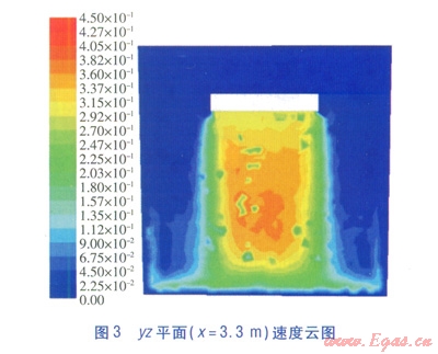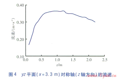 yz平面(x=3.3m)速度云圖見圖3,yz平面(x=3.3m)對(duì)稱軸(z軸方向)的流速見圖4。由圖3、4可知,貼附射流的流速沿射程方向呈現(xiàn)先增大后減小的變化趨勢。這種變化是貼附射流在發(fā)展的過程中,受豎向慣性力和豎向浮升力共同作用的結(jié)果。由于送風(fēng)溫度較低,在出口階段氣流密度較大,氣流豎向慣性力作用比豎向浮升力作用明顯,因此對(duì)氣流起著加速作用。隨著貼附射流的發(fā)展,氣流溫度升高,豎向浮升力作用加強(qiáng)以及氣流接近地面時(shí)受阻,流速逐漸下降。