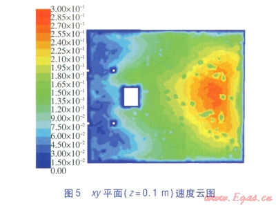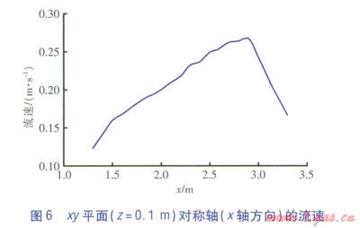 當(dāng)貼附射流接近地面時(shí),逐漸形成沖擊地板面的沖擊射流[7]。xy平面(z=0.1m)速度云圖見圖5,xy平面(z=0.1m)對(duì)稱軸(x軸方向)的流速見圖6。
