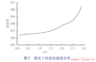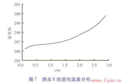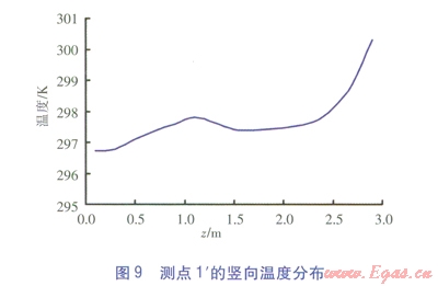 測點(diǎn)6、3、1¢的豎向溫度分布分別見圖7~9。由圖7~9可知,3個(gè)測點(diǎn)的溫度沿高度方向(三軸方向)逐漸增大。對(duì)于測點(diǎn)6、3,在0.1~1.2m高度范圍內(nèi)溫度緩慢升高,當(dāng)高于1.2m后溫升速度較快。對(duì)于測點(diǎn)l¢,在0.1~2.0m高度范圍內(nèi)溫度緩慢升高,在0.2~1.5m高度范圍內(nèi)溫度出現(xiàn)波動(dòng),這一高度區(qū)域恰好與坐姿下的人體腳踝到高于頭頂30cm一段吻合。當(dāng)高于2.0m后,溫升速度較快。