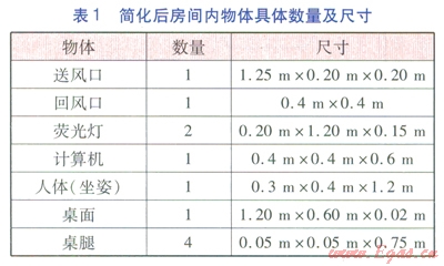 房間的物理模型見圖1,房間的長×寬×高為3.40m×2.90m×2.95m。房間圍護(hù)結(jié)構(gòu)視為絕熱,送風(fēng)裝置安裝于側(cè)墻上部,送風(fēng)口高度為2.2m?;仫L(fēng)口位置見圖l,尺寸為0.4m×0.4m。模型房間內(nèi)有2盞熒光燈,電功率均為36W。人體、計(jì)算機(jī)等熱源靠近回風(fēng)口一側(cè)的墻邊,人體和計(jì)算機(jī)的發(fā)熱量分別為l00W/人、300W/臺(tái)。將房間內(nèi)的人體、計(jì)算機(jī)、桌子等分別簡化成規(guī)格不同的立方體,簡化后房間內(nèi)物體具體數(shù)量及尺寸見表1。