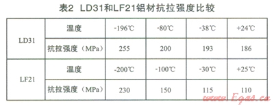 常見的氣化器材質(zhì)一般為LF21(美國牌號為3003)和LD31(美國牌號為6063),鋁合金LD31材質(zhì)從+24℃~-196℃強度相近,在常溫與低溫時,主體結(jié)構(gòu)應(yīng)力均衡、抗拉強度也是均衡的。而LF2l在常溫與低溫時,從+25℃~-200℃強度相差懸殊近l倍,抗拉強度相差較大,力學(xué)的差異也較大,具體抗拉強度參數(shù)見表2。在冷熱交替頻繁時容易造成金屬疲勞現(xiàn)象,而導(dǎo)致較易出現(xiàn)裂縫。但是LD31鋁材的抗氧化性能低于LF21鋁材,所以LD31鋁材需要進(jìn)行抗氧化防護。氣化器材質(zhì)宜選用LD31鋁型材。對于相同長度的換熱翅片管,顯然翅片管管徑大的氣化量大。