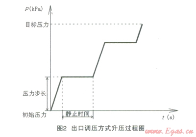 (2)自動調(diào)壓的出口調(diào)壓功能。通過設(shè)置壓力步長、靜止時間、目標(biāo)壓力等狀態(tài)參數(shù)在站控室的控制面板上進(jìn)行壓力調(diào)整,通過出口壓力的反饋值調(diào)整比對,最終達(dá)到設(shè)定的出口壓力。其調(diào)整的過程見圖2。