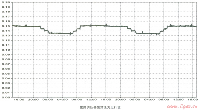 (3)壓力自動跟蹤功能減輕調(diào)度中心日常調(diào)壓的工作量。當(dāng)在較長一個時期,每天的壓力調(diào)整基本相同的情況下無須調(diào)度中心每時段去調(diào)整,只需將各時段所需調(diào)整的壓力參數(shù)下載到PLC,設(shè)備即可自動按預(yù)設(shè)曲線運(yùn)行。每天不同時段合理設(shè)定壓力,使調(diào)壓站的供氣量在設(shè)備運(yùn)行工況較好的量程范圍內(nèi),延長設(shè)備的使用壽命。
