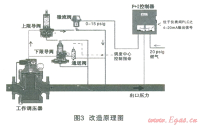 從原理圖上看,改造主要分兩部分:氣動控制部分(工藝設(shè)備部分)、電子控制部分(自控部分)。原主調(diào)壓器上的導(dǎo)閥利用做下限導(dǎo)閥。增加的設(shè)備主要有:機(jī)械式比例積分控制器(P+I控制器)、微流閥、上下限導(dǎo)閥(利用原導(dǎo)閥,增加上限導(dǎo)閥)、反饋管。電子控制部分改造包括:電纜導(dǎo)管的安裝、PLC模塊機(jī)柜的安裝、站內(nèi)P+I控制箱的安裝及SCADA界面的設(shè)計。
