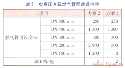 方案l~3各分項(xiàng)工程建設(shè)內(nèi)容分別見(jiàn)表2~6。表3中的熱網(wǎng)指一級(jí)管網(wǎng),由于二級(jí)管網(wǎng)(包括分散式低溫燃?xì)忮仩t房至熱用戶的管網(wǎng))造價(jià)由用戶分?jǐn)?,因此不?jì)入熱網(wǎng)造價(jià)中。由表2~6可計(jì)算得出方案l~3的工程造價(jià)分別為35237.74×104、43004.35×104、41047.11×104元。