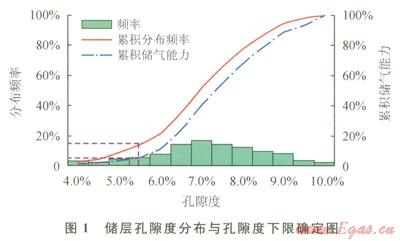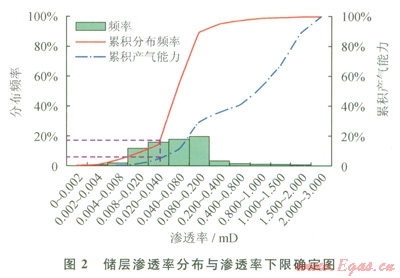 目前,經(jīng)驗(yàn)統(tǒng)計(jì)法在國(guó)內(nèi)外均得到了較為廣泛的使用[4-6],是一種以巖心測(cè)試分析得到的孔隙度和滲透率資料為基礎(chǔ),按照低孔低滲段累計(jì)儲(chǔ)滲能力丟失不超過(guò)總累計(jì)量的5%來(lái)劃分物性下限的方法。其中儲(chǔ)氣能力和產(chǎn)氣能力計(jì)算公式為:
