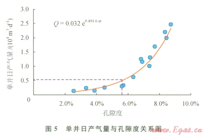 根據(jù)統(tǒng)計(jì)結(jié)果,氣層有效厚度取l5m,生產(chǎn)壓差設(shè)為5MPa,產(chǎn)能模擬實(shí)驗(yàn)結(jié)果如圖5所示??紫抖仍胶玫臍鈱樱瑔尉债a(chǎn)量越高,兩者之間具有很好的正相關(guān)關(guān)系。當(dāng)孔隙度大于5.59%時(shí),單井日產(chǎn)量能夠達(dá)到四川地區(qū)0.5×104m3/d的最低工業(yè)氣流標(biāo)準(zhǔn)。根據(jù)孔滲關(guān)系式,得到相應(yīng)滲透率下限為0.032mD。