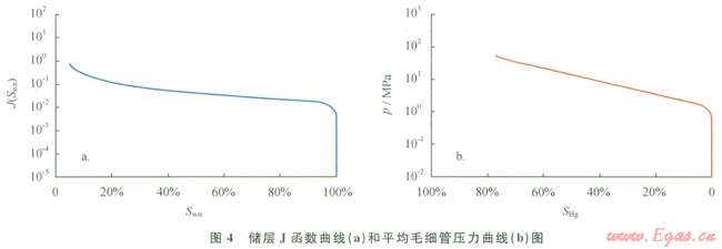 用J函數(shù)法對(duì)P地區(qū)須二氣藏4口井36塊巖心的壓汞資料進(jìn)行處理,得到J函數(shù)曲線(xiàn)(圖4-a)和儲(chǔ)層平均毛細(xì)管壓力曲線(xiàn)(圖4-b,圖中SAg為進(jìn)汞飽和度),再利用Purcell法和Wall法計(jì)算儲(chǔ)層的最小流動(dòng)孔喉半徑。
