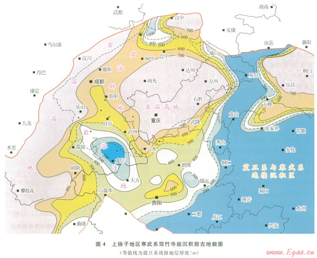 近期研究表明,上揚(yáng)子地區(qū)在震旦紀(jì)—早寒武世早期發(fā)生了3幕桐灣運(yùn)動(dòng)。桐灣運(yùn)動(dòng)Ⅰ幕發(fā)生在燈二段末期,Ⅱ幕發(fā)生在燈影組末期,Ⅲ幕發(fā)生在梅樹村末期。運(yùn)動(dòng)性質(zhì)均表現(xiàn)為整體抬升。受其影響,燈二段、燈四段形成了兩套風(fēng)化殼型巖溶儲(chǔ)層。露頭及鉆井資料證實(shí),兩套巖溶儲(chǔ)層不僅在威遠(yuǎn)、磨溪、高石梯等古隆起區(qū)發(fā)育,而且在貴州仁懷的桐梓剖面、凱里的基東剖面以及鄂西地區(qū)的利l井等,均可見風(fēng)化殼型巖溶儲(chǔ)層。把現(xiàn)有的資料點(diǎn)投在上揚(yáng)子地區(qū)筇竹寺組沉積前古地貌圖上(圖4),可以看出無(wú)論是侵蝕高地還是斜坡,甚至侵蝕洼地,均發(fā)育巖溶儲(chǔ)層,顯示出區(qū)域性分布特點(diǎn)。這一認(rèn)識(shí)對(duì)拓展燈影組油氣勘探具指導(dǎo)意義。