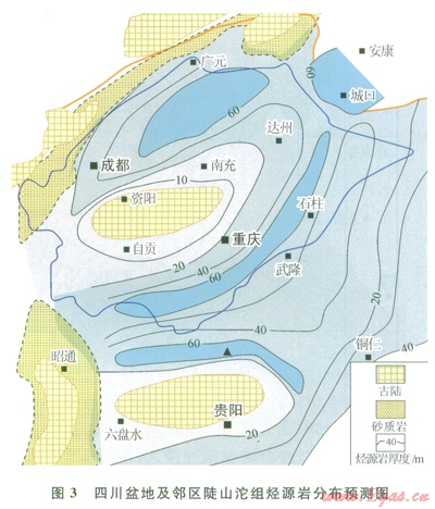 四川盆地腹部?jī)H有少量鉆井鉆遇該層系,且厚度薄,因而這套烴源巖在盆地分布往往不被看好。近期,筆者根據(jù)盆地區(qū)域地震的層位解釋,發(fā)現(xiàn)燈影組底界以下的反射層具有向古隆起超覆沉積的特征,層位應(yīng)歸屬陡山沱組。這表明陡山沱沉積期,上揚(yáng)子地區(qū)存在兩個(gè)同沉積期古隆起,分別是黔中隆起和樂山—龍女寺古隆起陡山沱組烴源巖在古坳陷區(qū)厚度較大,而隆起區(qū)厚度明顯減薄。圖3是筆者根據(jù)地震解釋結(jié)合露頭剖而資料推測(cè)的陡山沱組烴源巖分布圖。從圖3可以看出,資陽(yáng)古隆起兩側(cè)的川西、川東地區(qū)均存在陡山沱組烴源巖,厚度在20~60m。這一認(rèn)識(shí)大大提升了震旦系含油氣系統(tǒng)的資源潛力。