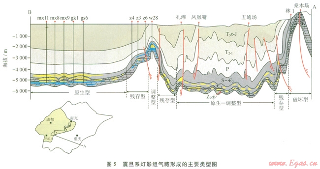 新近紀(jì)以來(lái)的喜馬拉雅運(yùn)動(dòng),對(duì)盆地深層震旦系產(chǎn)生4種變形方式:①強(qiáng)烈的褶皺沖斷作用變形,主要發(fā)生在盆地周緣,導(dǎo)致震旦系出露地表,如盆地東南緣的桑木場(chǎng)構(gòu)造;②強(qiáng)烈褶皺、隆升,但震旦系未遭受剝蝕,如威遠(yuǎn)地區(qū)隆升幅度較高(3000~4000m)[30];③中淺層變形強(qiáng)烈,但震旦系未卷入變形或變形微弱,如川東、蜀南地區(qū);④深層及中淺層均未卷入變形或變形微弱,如磨溪—高石梯地區(qū)。除第一變形方式對(duì)震旦系氣藏起破壞作用之外,其余的變形對(duì)震旦系氣藏調(diào)整有影響,但未被破壞。基于此,可將喜山期震旦系氣藏可分為調(diào)整型(如威遠(yuǎn)氣田)、殘存型(如資陽(yáng)地區(qū))、原生型(如磨溪 高石梯氣田)、原生—調(diào)整型(如蜀南深層)(圖5)。按此評(píng)價(jià)有利勘探區(qū)帶,磨溪—高石梯廣安一帶長(zhǎng)期處于古今構(gòu)造疊合的高部位,是最有利勘探區(qū);有利區(qū)為遂寧—南充斜坡帶,較有利區(qū)為川東—蜀南深層。