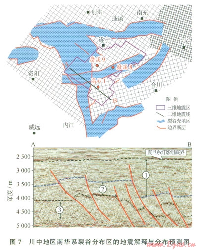 根據(jù)對(duì)川中地區(qū)震旦系燈影組以下層位的地震反射特征解釋,可以進(jìn)一步識(shí)別出裂谷形態(tài)及分布特征。圖7可以看出在南充—遂寧之間、磨溪地區(qū)存在近東西向裂谷,而高石梯以西存在近南北向裂谷。根據(jù)3D地震反射特征,可以將裂谷區(qū)充填地層劃分為3的反射層組(圖7)。①反射層組為較連續(xù)反射,成層性好,厚度變化較大,地震反射時(shí)間介于600~1300ms;②反射層組為斷續(xù)反射,底界反射波組連續(xù)性較強(qiáng),可能是某個(gè)地層界面的反射特征;③反射層組為雜亂反射。從解釋的斷裂來(lái)看,既有正斷層也有逆斷層,反映裂谷區(qū)經(jīng)歷了復(fù)雜的構(gòu)造演化歷史。當(dāng)然,區(qū)內(nèi)的地震解釋方案尚沒有得到鉆井證實(shí),有待進(jìn)一步深化研究。