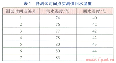 各測(cè)試時(shí)間點(diǎn)實(shí)測(cè)供回水溫度見表1,測(cè)試期間室外空氣溫度基本穩(wěn)定在-5.9℃。