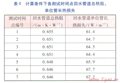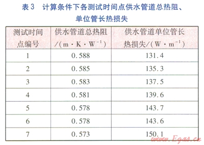 計(jì)算條件(指保溫層、保護(hù)層材料熱導(dǎo)率均取計(jì)算值時(shí))下各測(cè)試時(shí)間點(diǎn)供回水管道總熱阻、單位管長(zhǎng)熱損失分別見表3、4。