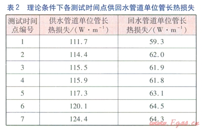 由已知數(shù)據(jù)可計(jì)算得附加熱阻為0.043m·K/W,將Ri+RPE+Rsoi定義為總熱阻。當(dāng)保溫層材料熱導(dǎo)率取理論值(0.0275W·m-1·K-1),保護(hù)層材料熱導(dǎo)率取理論值(0.041W·m-1·K-1)時(shí),總熱阻計(jì)算結(jié)果為0.693m·K/w。理論條件(指保溫層、保護(hù)層材料熱導(dǎo)率均取理論值時(shí))下各測(cè)試時(shí)間點(diǎn)供回水管道單位管長(zhǎng)熱損失見表2。