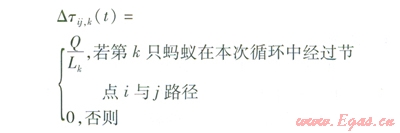 Dtij,k(t)——本次循環(huán)中第k只螞蟻在節(jié)點(diǎn)i與j路徑上的信息素增量