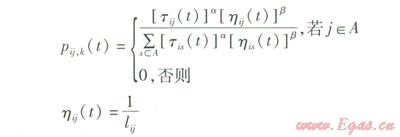 式中Pij(t)——t時刻螞蟻k由節(jié)點(diǎn)i轉(zhuǎn)移到節(jié)點(diǎn)j的狀態(tài)轉(zhuǎn)移概率