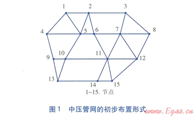 利用C語言編制蟻群算法程序,經(jīng)過多次試算確定蟻群算法的參數(shù)為:m=15,a=1.0,b=5.0,r=0.1,Q=100。迭代最大次數(shù)為200,防止出現(xiàn)死循環(huán)。優(yōu)化后的環(huán)狀管網(wǎng)布置形式見圖2,燃?xì)夤芫W(wǎng)總長度為15.143km。