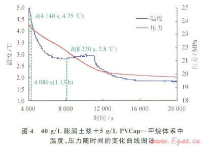 圖3、4反映了加入PVCap后膨潤七漿中水合物的生成過程。圖3中,氣液體系的壓力~溫度曲線在A點(diǎn)處,即l.15h(4140s)時出現(xiàn)突變.表明體系中初始生成水合物。圖4中,在B點(diǎn)處,即2.28h(8220s)之前,體系溫度與壓力均平緩下降,未出現(xiàn)波動,表明雖然體系中已經(jīng)初始生成了水合物,但生成的量較小且生長緩慢。從2.28 h開始,溫度突然上升,壓力開始大幅下降,表明l.15~2.28h為水合物生長階段,在天然氣水合物抑制劑的作用下,水合物以較低的生長速率緩慢生成。2.28h之后為水合物大量生成階段,此時抑制劑已失效,高壓釜內(nèi)開始大量生成水合物。與膨潤土漿相比,加入PVCap后水合物的成核期僅從1.05h延長到1.15h,而水合物的生長期從0.05h延長到1.13h,表明PVCap對水合物成核期影響不大,而主要是在水合物生長期發(fā)揮抑制作用。通過分析,可將PVCap作用下水合物的生成過程分為3個階段:水合物成核階段、水合物緩慢生長階段和大量生成階段。這與赫瑞瓦特大學(xué)楊金海[12]。通過超聲波技術(shù)對相同產(chǎn)品作用下水合物的生成過程進(jìn)行劃分的結(jié)果一致。結(jié)果表明,聚乙烯基己內(nèi)酰胺PVCap主要通過延緩水合物生長發(fā)揮抑制作用,其分子結(jié)構(gòu)中七元內(nèi)酰胺環(huán)上的氧原子可以與水合物表面形成氫鍵,通過空間位阻作用抑制水合物生長[22]。