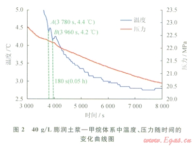 VP/VC屬于第二代天然氣水合物動力學(xué)抑制劑,由N-乙烯基吡咯烷酮和N-乙烯基己內(nèi)酰胺共聚而成。圖7、8反映了加入VP/VC后膨潤土漿中水合物的生成過程。