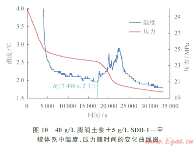 三元聚合物抑制劑SDH-l在VP/VC分子結(jié)構(gòu)基礎(chǔ)上引入了強(qiáng)親水性基團(tuán),以增加聚合物的水溶性。圖9、10反映了加入SDH-1后膨潤土漿中水合物的生成過程。