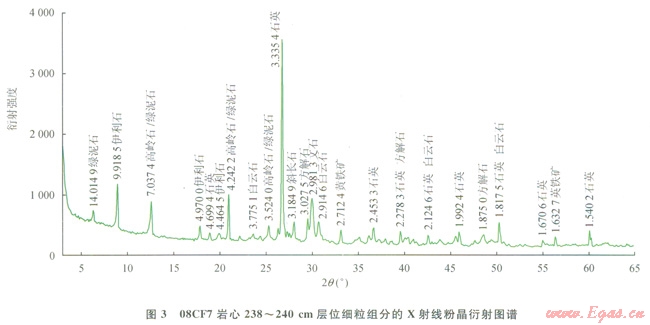 20個代表性樣品細粒組分的X射線衍射(XRD)結(jié)果見圖3和表l。細粒組分的礦物組成主要為伊利石、綠泥石(高嶺石)等黏土礦物,其占細粒組分總量的33.3%~55.5%,平均含量為43.9%,黏土礦物總含量變化不大,但巖心上部樣品的黏土總含量略高,中間部分樣品則較少。細粒組分中的其他礦物主要有石英、長石、黃鐵礦以及方解石、文石、白云石等碳酸鹽類礦物。