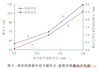 結(jié)合圖7、8分析可以發(fā)現(xiàn)2個十分明顯的現(xiàn)象:①圖中第2個點與第3個點之間的斜率k2遠(yuǎn)大于第1個點與第2個點之間的斜率k1,結(jié)合數(shù)據(jù)具體分析可得:在梨形脹管器的外徑為128mm時,其在整形的過程中所需的整形壓力、梨形工具磨損厚度、梨形工具磨損寬度、套管回彈量都顯著增加,由此判斷該組梨形脹管器的外徑級差存在缺陷,在整形過程中容易造成卡鉆等井下事故,應(yīng)該更加合理的優(yōu)化其整形級差;②外徑為l22mm的梨形脹管器對變形套管整形時其整形力、套管回彈量、工具磨損量均較小,由此認(rèn)為2mm的單次整形量最合理。