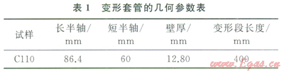 該實驗主要分為2個階段,第1個階段是橢圓形套管的制備,其方法是將理想套管(C110×177.8×12.65)放在YAW-200壓力試驗機(jī)上進(jìn)行壓扁實驗(圖l-a),變形尺寸是基于現(xiàn)場套管變形數(shù)據(jù)(表1);第2階段是用3只不同外徑的梨形脹管器對變形套管的整形測試,該實驗在YS32-500型的四方柱萬能液壓試驗機(jī)上完成(圖l-b)。