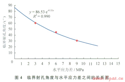 利用本壓裂模擬實驗結(jié)果,可回歸出產(chǎn)生非對稱多裂縫系統(tǒng)的臨界射孔角度和水平應(yīng)力差的相互關(guān)系曲線(圖4)。當(dāng)水平應(yīng)力差和定向射孔方位角的坐標(biāo)落在藍色臨界線的左下側(cè)時,人工水力裂縫會沿定向射孔方向起裂,形成一條基本對稱的雙翼平直裂縫或雙翼彎曲裂縫;當(dāng)水平應(yīng)力差和定向射孔方位角的坐標(biāo)落在藍色臨界線的右上側(cè)時,人工水力裂縫會沿著最大水平地應(yīng)力方向起裂,產(chǎn)生一條穿過微環(huán)面的雙翼平直裂縫;當(dāng)水平應(yīng)力差和定向射孔方位角的坐標(biāo)正好落在藍色臨界線上時,人工水力裂縫可能沿著定向射孔方向和最大水平地應(yīng)力方向多點同時起裂,形成非對稱多裂縫系統(tǒng)。該預(yù)測結(jié)果與本文參考文獻[3]的有限元模擬計算結(jié)果比較一致。運用該圖可以用來預(yù)測定向射孔水力壓裂裂縫形態(tài),為現(xiàn)場壓裂施工提供參考。但鑒于實際地層因素和完井因素的影響,實際的臨界射孔角度可能會有所變化。