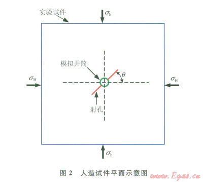 以上情況與定向射孔參數(shù)和目標(biāo)地層性質(zhì)(地應(yīng)狀態(tài)、地層非均勻性等)密切相關(guān)。然而目前對此問研究甚少。筆者采用大型真三軸水力壓裂物理模擬驗系統(tǒng)[13]進行了室內(nèi)物模實驗,研究了定向射孔水壓裂人工水力裂縫的形態(tài)和影響因素,并對完井和裂施工提出了一些工程建議。