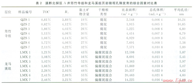泥貝巖微觀孔隙的發(fā)育演化,不是受單一的條件控制,而是巖性、礦物組合、溫壓等多方面因素影響的綜合體[5,26]。有機碳含量、干酪根類型、黏土礦物與含量、熱演化程度等因素,均不同程度地控制著泥頁巖微觀孔隙的發(fā)育[26]。通過荇類分析化驗的對比研究發(fā)現(xiàn),滇黔北高演化區(qū)筇竹寺組泥頁巖微觀孔隙的發(fā)育演化也與上述因素有著密切的關(guān)系。