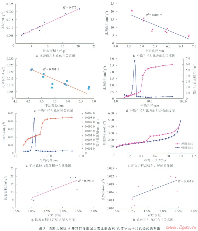 對滇黔北A井筇竹寺組泥頁巖樣品進行了比表面積測量和孔徑在1.5~300.0nm樣品的孔體積測試,得出筇竹寺組頁巖氣儲層的比表面積為1.915~7.691m2/g.平均為5.185m2/g;孔體積為0.0051~0.0108mL/g,平均為0.0080mL/g;平均孔徑為5.38~10.85nm。反映筇竹寺組泥頁巖的比表面積和孔體積均較大。有利于頁巖氣的吸附。從中也可以看出,其孔比表而積與孔體積二者之間具有較好的正相關(guān)性,即隨著比表面積的增大??左w積也隨之增大(圖3-a、3-b)。與之相反。比表面積、孔體積與平均孔徑則呈負相關(guān)性。即比表面積、孔體積均隨孔徑的增大而減小(圖3-c、3-d).且當孔徑小于10nm時,孔體積分布曲線很陡,而當孔徑大于等于10nm時,曲線則逐漸變得平緩,說明孔徑范圍在1~8nm內(nèi)的孔隙對泥頁巖比表而積、孔體積值的貢獻最大(圖3-c),即小孔隙越發(fā)育,頁巖的比表面積、孔體積越大,越有利于泥頁巖對頁巖氣的吸附聚集。