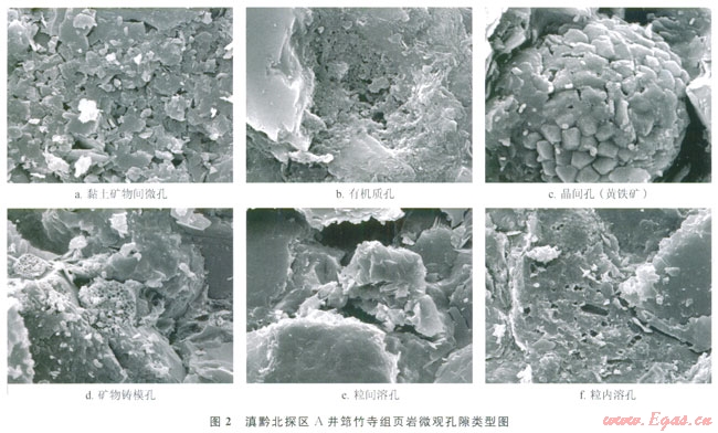 根據(jù)IUPAC的劃分方案[24-25],按孔隙大小可將滇黔北地區(qū)筇竹寺組泥頁巖微觀孔隙,劃分為微孔(小于l0nm)、小孔(10~100nm)、中孔(100~1000nm)和大孔(大于l000nm) [26];按成因,可將基質(zhì)孔隙區(qū)分為礦物間微孔、有機質(zhì)孔、晶間孔、礦物鑄???、次生溶蝕孔等(圖2),這類孔隙分別代表了不同成因類型及不同大小。在所有微觀孔隙中,微孔隙對頁巖氣儲集空間的貢獻最大,而小孔和大孔。則分別可能為泥頁巖毛細凝結(jié)、擴散和滲流、層流的主要區(qū)域[26]。