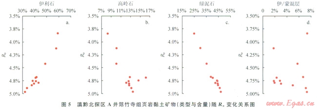 研究區(qū)筇竹寺組頁巖熱演化程度較高,R。均大于3.0%。根據(jù)巖心不同黏土礦物含量隨R。的變化關(guān)系圖(圖5)可以看出,隨R。的增大,具有較大比表面積的伊利石含量增大、伊/蒙混層含量減少,具有較小比表面積的綠泥石含量增大、高嶺石含量增大。而上覆的龍馬溪組頁巖熱演化程度相對低些(R。多小于3.0%),與筇竹寺組頁巖黏土礦物相比,其伊利石含量高(13%~36%)、伊/蒙混層含量比較少(2%~6%)、綠泥石含量高(13%~32%)、高嶺石含量高(6%~9%)。因而出現(xiàn)了筇竹寺組黏土礦物間微孔隙的比表面積和孔體積遠比龍馬溪組小的情形,導致其比表面積和孔體積均較小的狀況(表2)。因此,熱演化程度通過對黏土礦物類型與含量的影響,也同樣控制著黏土礦物間微孔隙的發(fā)育程度。由此得出,已處于過成熟中期后的滇黔北筇竹寺組頁巖層,經(jīng)歷悠久的地質(zhì)作用過程和過高熱演化程度嚴重制約了其微觀孔隙結(jié)構(gòu)特征,呈現(xiàn)微孔隙驟減和比表面積、孔體積明顯較小的情形,不利于頁巖氣的吸附儲集,結(jié)果出現(xiàn)筇竹寺組頁巖氣富集程度不如龍馬溪組的狀況。