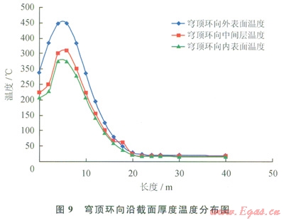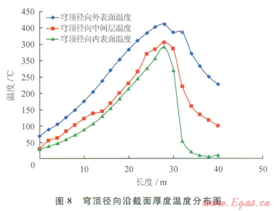 穹頂混凝土的外表面溫度無論是徑向還是環(huán)向,最高溫度均在450℃左右。內外表面溫度相差l00℃左右,將產生較大的溫度應力(圖8、9)。