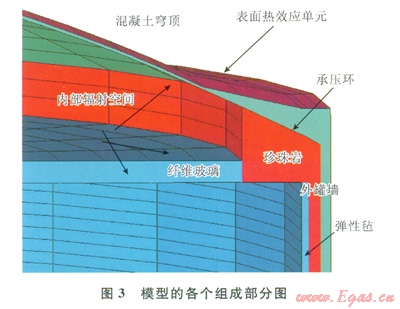 儲罐瞬態(tài)熱力分析模型包含穹頂和混凝土外罐墻。局部還有結構的鋼內襯板、玻璃纖維彈性氈、珍珠巖保溫材料和鋼筋混凝土承壓環(huán)。其穹頂厚度約為400mm。