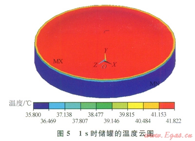 1s時的溫度分布可以看到穹頂已經獲得了初始的熱邊界條件,穹頂外表面是夏季最熱天的環(huán)境溫度41℃(圖5)。