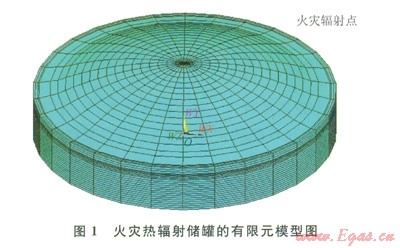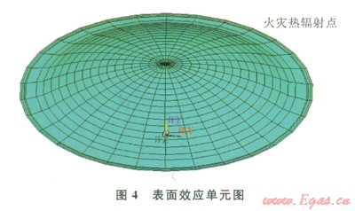 其中承壓環(huán)及襯板用shelll31單元建立、其他部分可用實體單元solid70。有限元模型求解的是連續(xù)體問題,但在此模型中,安全閥的位置離穹頂約16m,是非連續(xù)孤立的節(jié)點。為了能讓安全閥的熱輻射能傳遞到穹頂。必須借助一類特殊的單元即表面效應單元,實現孤立火災點和儲罐各個部分的熱輻射。