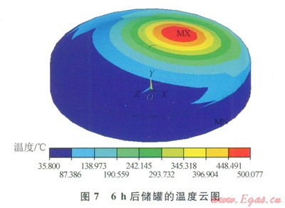 火災發(fā)生6h時后,穹頂的外表面溫度已經升高到了500℃左右,同時高溫區(qū)域也增大了很多(圖7)。