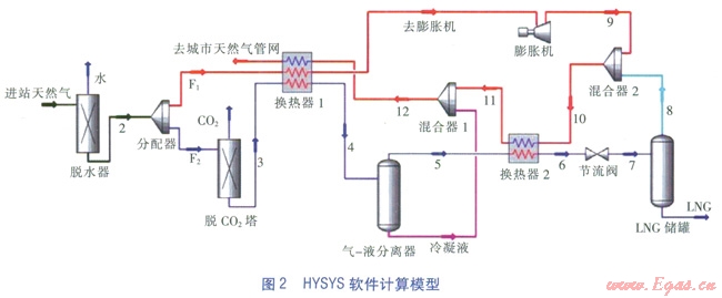 通往膨脹機的膨脹氣流F1經(jīng)過換熱器l后溫度降低,然后進入膨脹機膨脹降溫降壓,與LNG儲罐排出的低溫天然氣匯合后通過換熱器2,然后與氣一液分離器分離出的冷凝液混合后通過換熱器1,為液化氣流F2提供冷量后溫度升到常溫,進入城市管網(wǎng)(圖1中紅色線條部分)。