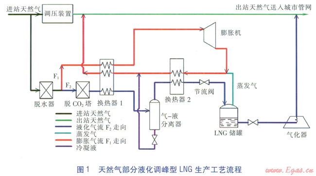 來自長輸管道的天然氣已進行一定程度的凈化處理,要達到液化天然氣氣質(zhì)及制冷過程的要求,還需要進行脫水以及脫CO2處理。天然氣部分液化調(diào)峰型LNG生產(chǎn)工藝流程見圖l。
