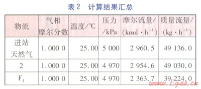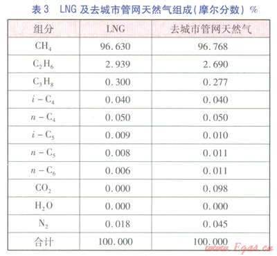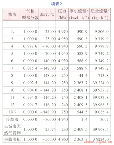 調(diào)試流程直至收斂,得到計算結(jié)果見表2,LNG及去城市管網(wǎng)天然氣組成見表3。